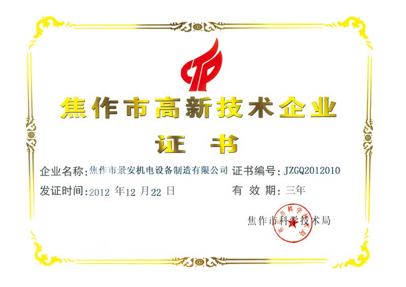 焦作市高新技術(shù)企業(yè)證書
